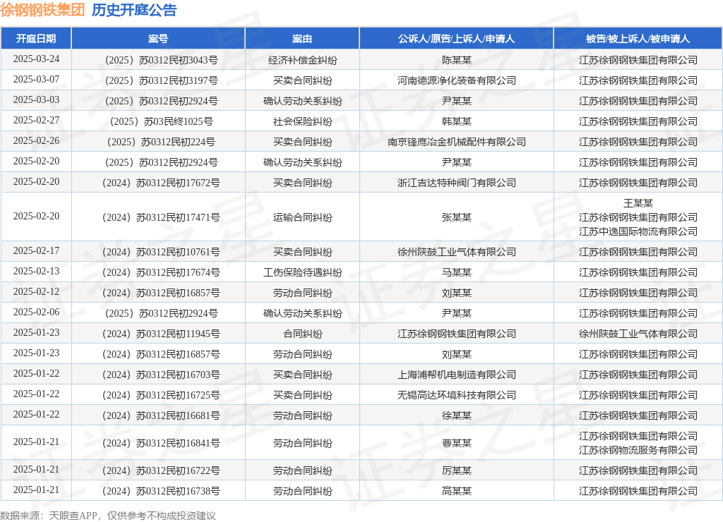 本站消息,根据天眼查APP显示,近日公布了一则江苏徐钢钢铁集团有限公司作为被告/被上诉人的开庭公告,详细内容如下: